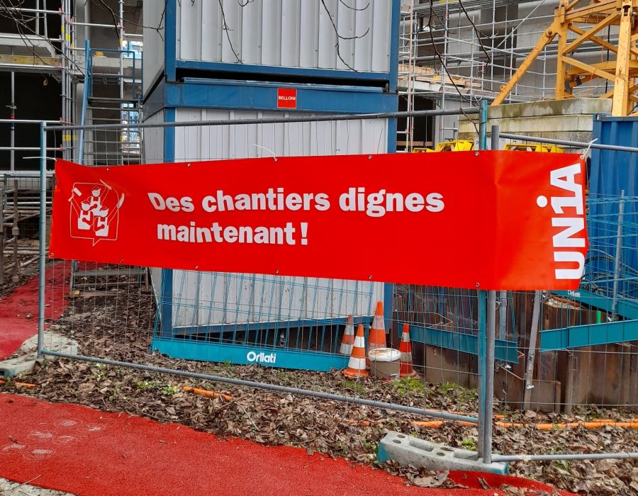 Banderole d'Unia "Des chantiers dignes maintenant!" à l'entrée d'un chantier.