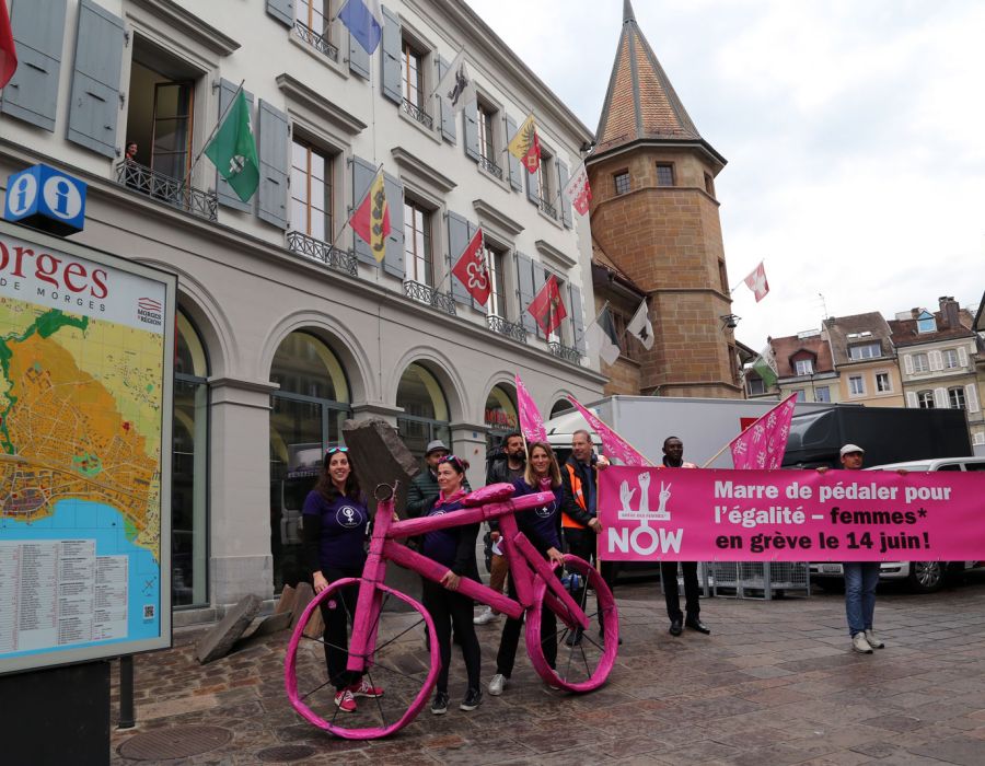 A l’occasion de l’étape du Tour de Romandie à Morges, Unia a rappelé, lors d’une action colorée, l’importance de se mobiliser le 14 juin prochain pour obtenir, enfin, l’égalité