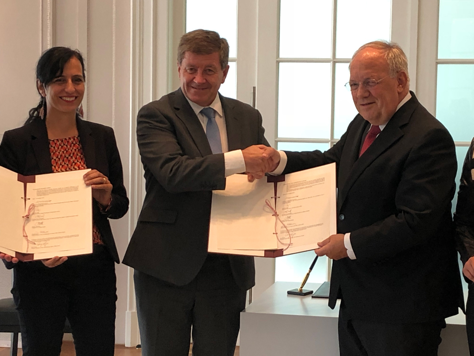 Vania Alleva, vice-présidente de l’Union syndicale suisse, Guy Ryder, secrétaire général de l’Organisation internationale du travail et Johann Schneider-Ammann, réunis par la déclaration tripartite scellant le renforcement du partenariat social.