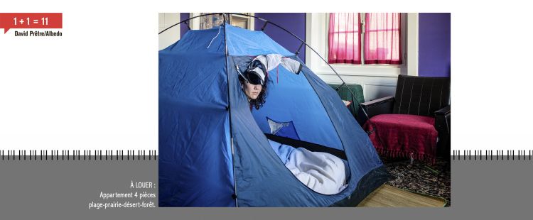 Une tente de camping installée dans un appartement. En légende on peut lire: "A louer: appartement 4 pièces plage-prairie-désert-forêt."