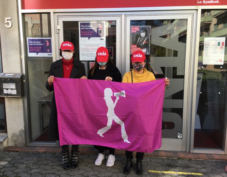 A l’occasion de la Journée internationale pour les droits des femmes, des vendeuses, soutenues par Unia, ont revendiqué à Lausanne de meilleures conditions de travail et un salaire digne