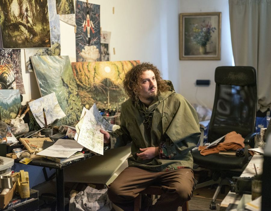 François Monthoux dans son univers de travail, entouré de tableaux.