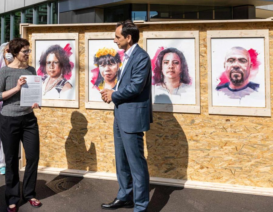 Jeudi dernier à Bâle, Public Eye a remis à Roman Mazzotta, directeur de Syngenta Suisse, une pétition contresignée par près de 38000 personnes, devant des portraits de militants...