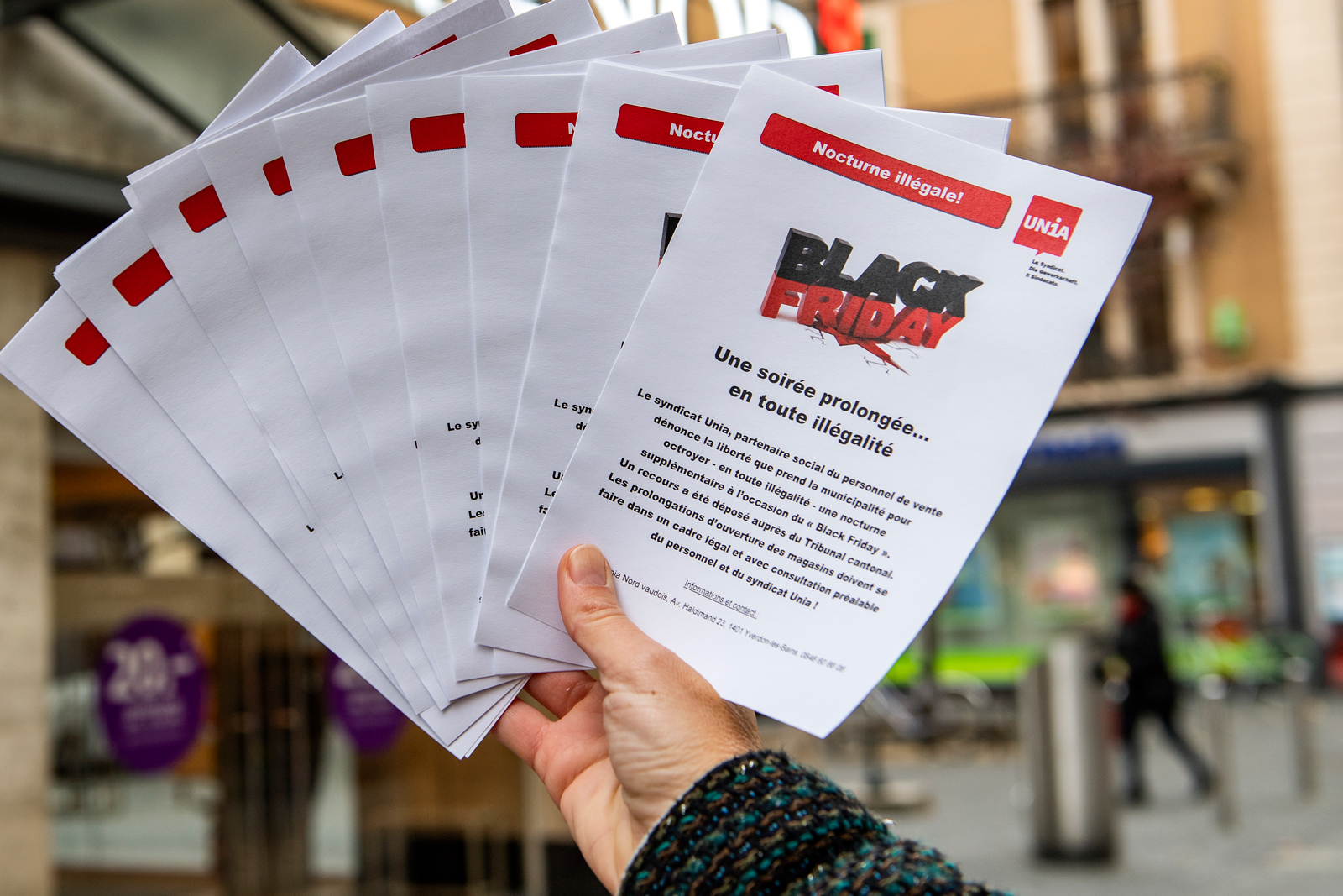 C'est avec consternation qu'Unia a pris connaissance de la décision de la Municipalité d'Yverdon-les-Bains de prolonger les horaires d'ouverture des commerces au prétexte du Black Friday. Une initiative prise de manière unilatérale, sans consulter le syndicat. «Tel que prévu par le règlement communal, le Black Friday n'est pas un événement qui justifie une telle extension, c'est aussi pour cette raison que nous avons interjeté un recours urgent le 20 novembre auprès du Tribunal cantonal demandant l'annulation de la fermeture des magasins à 20h le vendredi 23 novembre, au lieu de 18h30», explique Nicolas Rochat Fernandez, responsable de la section Unia Nord vaudois. Le syndicat a également distribué des tracts dans les différents commerces de la ville pour sensibiliser le personnel de vente et les clients.